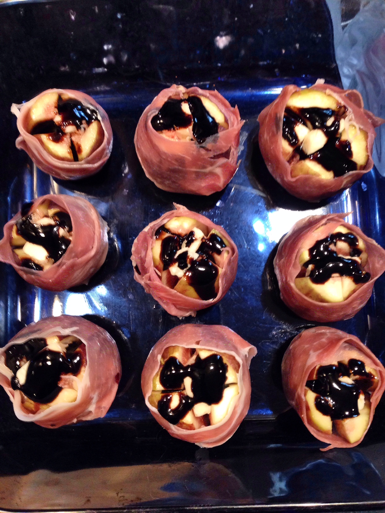 Pop these babies into an oven at 420 degrees until the prosciutto looks like it’s getting crispy and the cheese has softened. We normally leave them in for about 10 minutes.  If it doesn’t look like it got crispy enough, put the broiler on for a few minutes to crisp it up.