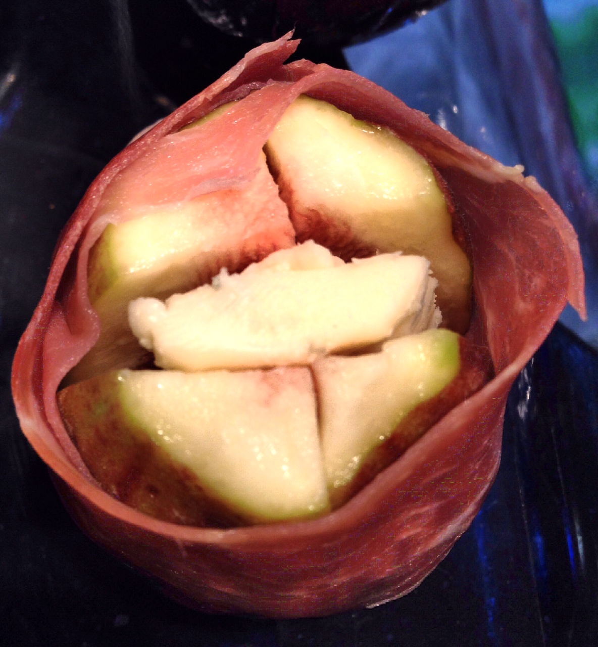 Once you have the cheese in your figs, take a strip of prosciutto and wrap it around the outside of the fig, almost to squeeze that “X” you cut into the fig closed again.