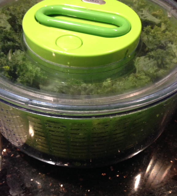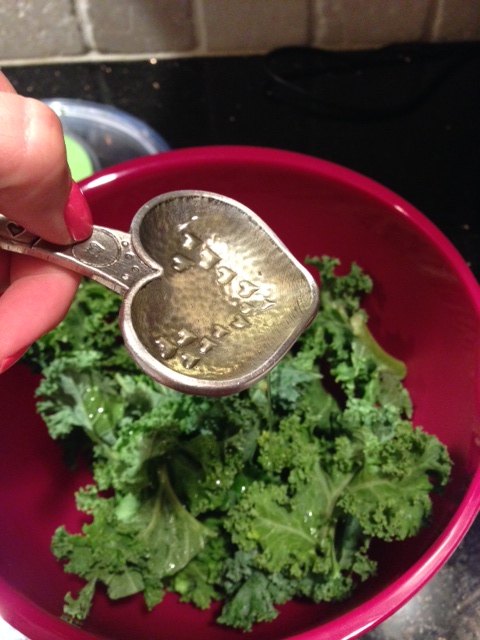 Preheat the oven to 350 degrees. I used my salad spinner to thoroughly wash and dry a bag of kale. Then I picked out the good pieces and threw them into a bowl with 1-2 tablespoons of extra virgin olive oil. Toss the kale with the olive oil being sure that each piece is coated.