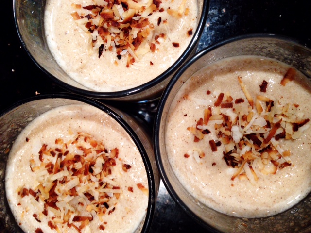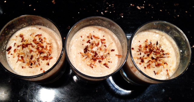 After the coconut was in I added the rest of the ingredients and pulsed them in my blender. I pulsed the blender until it seemed like everything was smooth. I divided it amongst my glasses and topped each one with a little of the left over toasted coconut I saved.