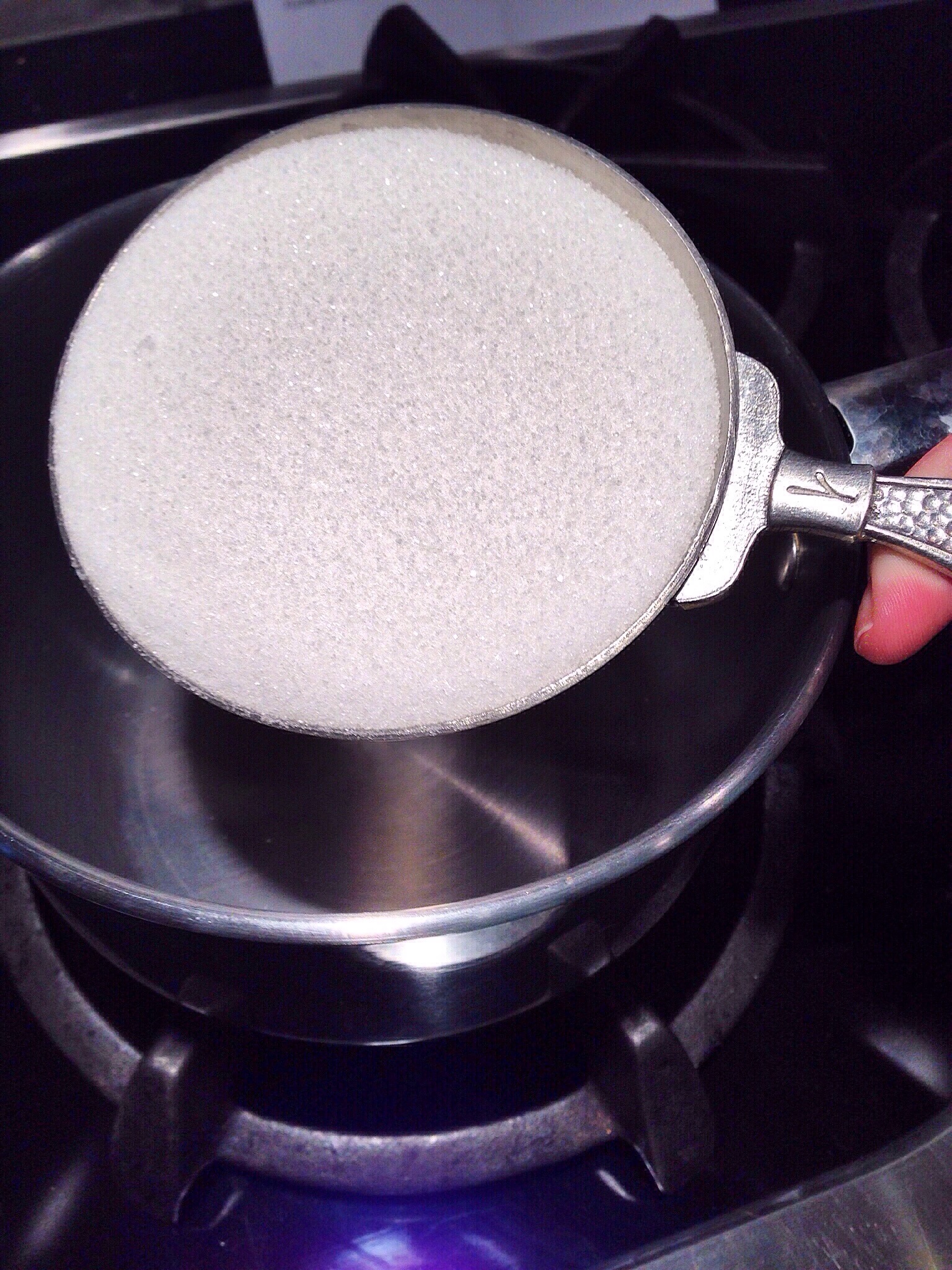 To start out put a cup of sugar in a sauce pan on medium heat and start stirring. Stir this constantly with a rubber spatula until it turns to a light brown liquid. The sugar will go through a clumpy stage and then it will start to brown and melt.